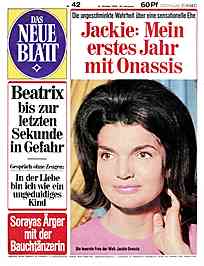 | | DAS NEUE BLATT - Titel: "Brigitte Bardot: Süßes Leben ohne Sachs" | | DAS NEUE BLATT - Titel: "Die ungeschminkte Wahrheit über eine sensationelle Ehe - Jackie: Mein erstes Jahr mit Onassis" | | Neue Post - Titel: "Sophia Loren: Ich lebe nur noch für meinen Sohn" - Themen z.B.: "Maria Callas: Ich liebe Onassis immer noch", "Kuli spielt des Teufels General", "Claus verriet bei der Taufe in Holland: Jetzt wünschen wir uns eine Tochter" |